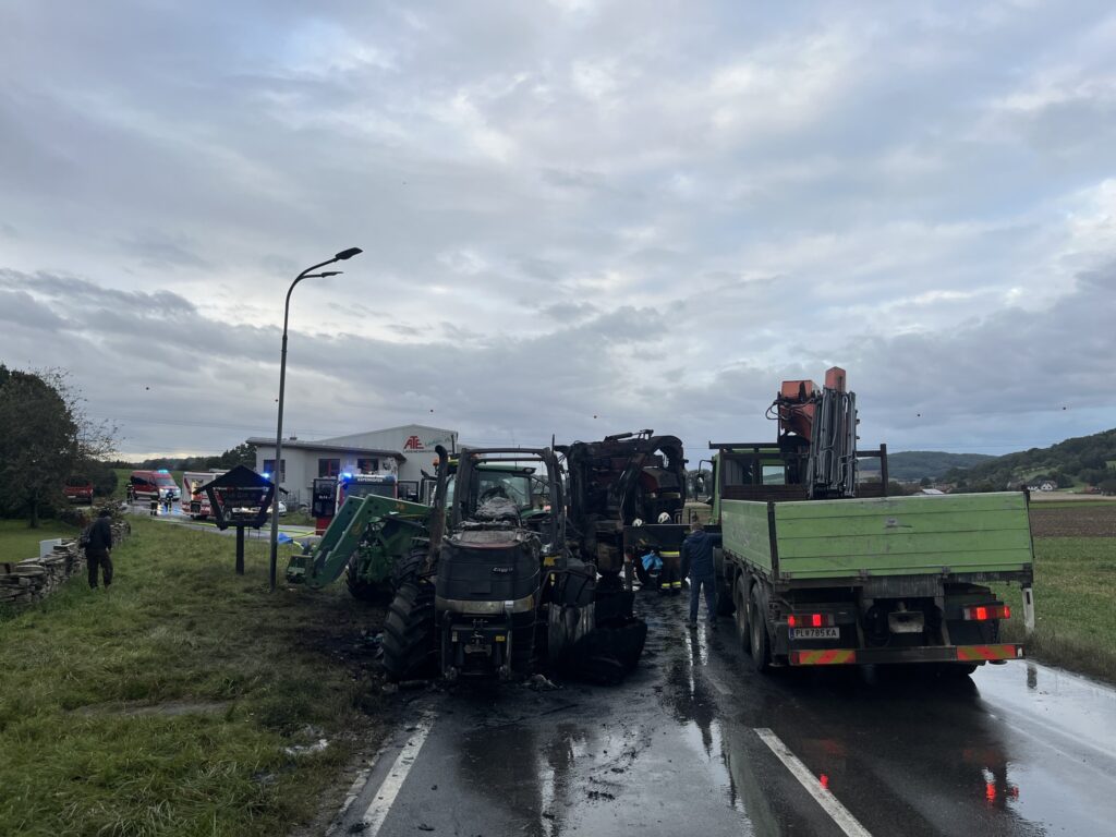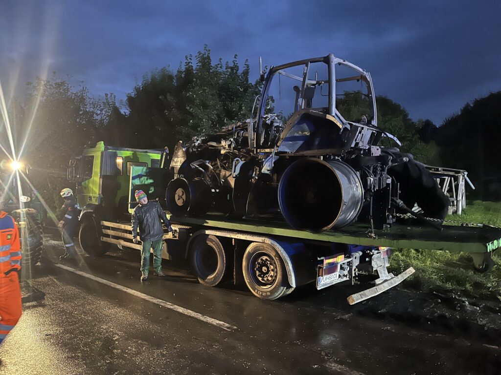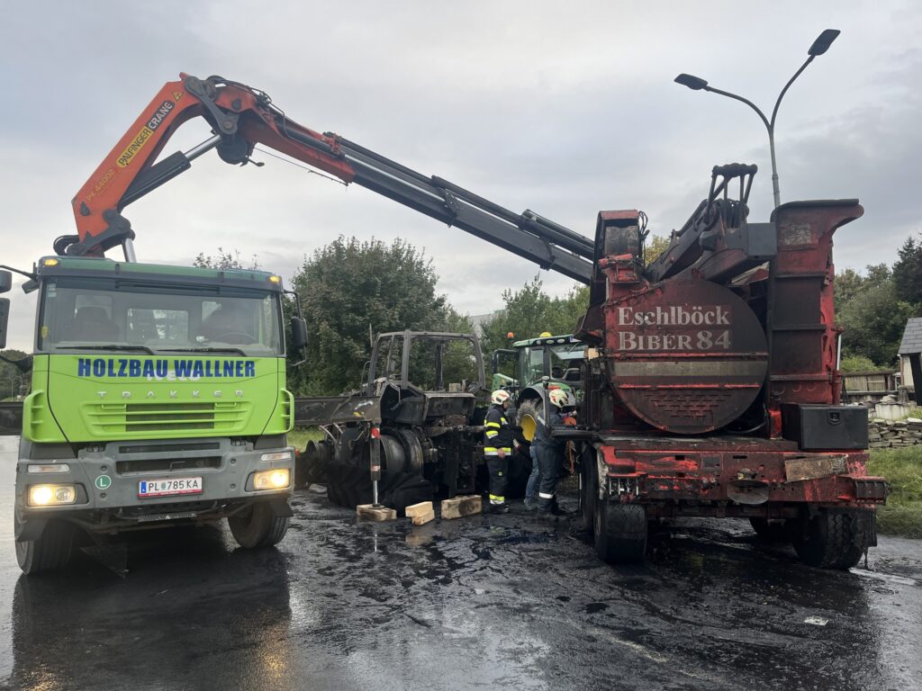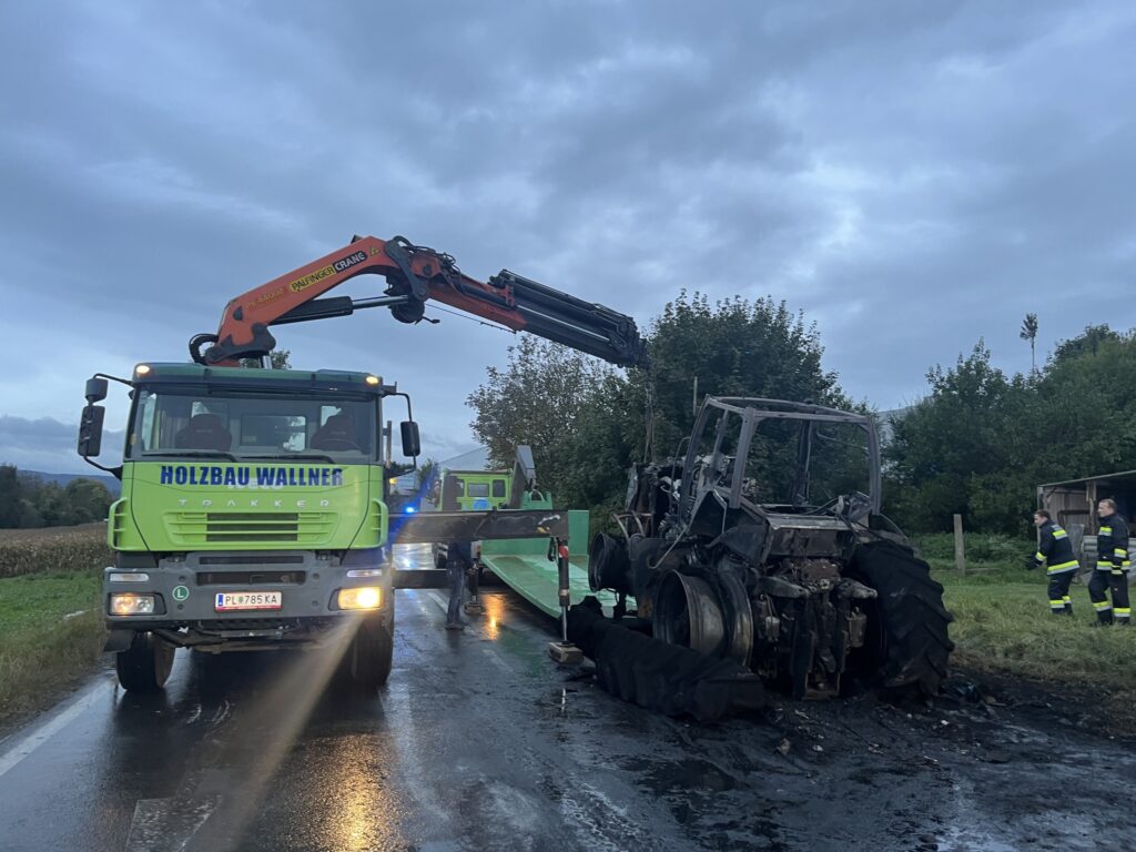 Im Anschluss an umfangreiche Nachlöscharbeiten sowie Kontrollen mittels mehrerer Wärmebildkameras wurde gemeinsam mit der Firma Holzbau Wallner und in enger Absprache mit dem anwesenden Fahrzeughalter das Fahrzeug samt Anbaugerät von der Bundesstraße entfernt.